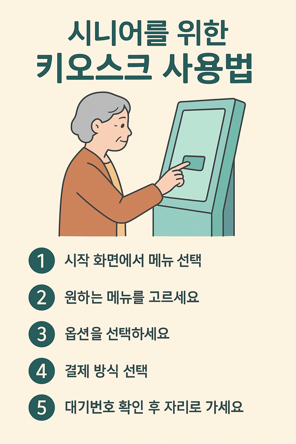 카테고리 없음 시니어를 위한 키오스크 사용법, 천천히 따라 해보세요 by 늘배움수 2025. 4. 18. 요즘은 식당, 병원, 영화관, 은행 등 많은 곳에서 **'키오스크'**라는 무인 기계를 사용해 주문하거나 접수해야 하는 일이 많아졌습니다. 처음엔 당황스럽지만, 몇 번만 해보면 생각보다 쉽고 편리하게 이용할 수 있습니다.오늘은 시니어분들을 위해 가장 기본적인 키오스크 사용법을 친절하게 설명드릴게요.키오스크란 무엇인가요?**키오스크(Kiosk)**는 사람이 직접 주문을 받지 않고,화면을 터치해서 스스로 주문, 접수, 결제를 할 수 있는 무인 기계입니다.예: 패스트푸드점: 햄버거 주문병원: 접수 및 수납카페: 커피 주문키오스크 사용, 이렇게 따라 해보세요1단계. 시작 화면에서 메뉴 선택화면에 다양한 메뉴가 보입니다."주문하기", "접수하기", "한글", "외국어" 중→ 한글을 먼저 누르세요.Tip. 글씨가 작게 보이면 화면을 손가락으로 살짝 늘려보거나, 점원이 도와달라고 요청해도 괜찮아요!2단계. 원하는 메뉴를 고르세요사진과 함께 메뉴가 나와요.사진을 누르면 선택됩니다.수량 조절도 가능합니다. (+, - 표시 이용)3단계. 옵션을 선택하세요뜨거운/차가운, 크기, 추가 선택 등을 고를 수 있어요.예: 아메리카노 → 아이스 / 라지 / 샷 추가4단계. 결제 방식 선택보통 화면에 이렇게 나옵니다:카드 결제현금 결제모바일 결제→ 카드 결제를 누르시고, 카드 단말기에 카드를 꽂거나 터치하세요.Tip. 결제가 끝난 후, 영수증이 필요하면 "영수증 출력"을 누르세요.5단계. 대기번호 확인 후 자리로 가세요주문이 끝나면 대기번호 또는 호출번호가 나와요.이 번호가 불리면 음식을 받으면 됩니다!자주 하는 실수와 해결 방법실수 해결 방법1. 화면이 너무 빨리 넘어가요 ->천천히 눌러도 인식되니 당황하지 마세요.2. 다시 처음부터 하고 싶어요 ->'처음으로' 버튼을 누르거나 직원에게 요청하세요.3. 결제가 안 돼요 ->카드를 다시 꽂거나, 직원에게 도움을 요청하세요.마무리하며키오스크는 처음에 조금 낯설지만,3~5번만 해보면 손에 익는 간단한 도구입니다.혹시 키오스크 사용이 어렵게 느껴지셨다면,주변 분들과 함께 연습해보시고, 이 글을 공유해 주세요.관심 있으신 분은 ‘늘배움수’ 블로그 구독해 주세요. 공유하기 게시글 관리 늘배움수
